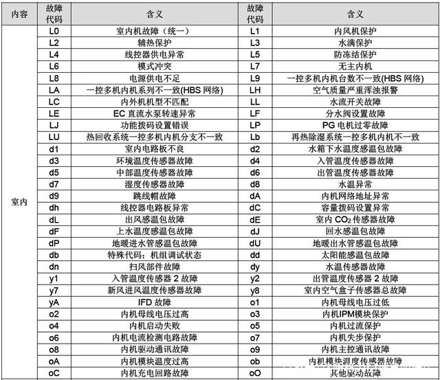 1、室内机对应的故障代码表: